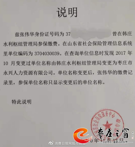 棗莊市薛城區(qū)社會(huì)保險(xiǎn)服務(wù)中心提供張偉華社保變更的說明